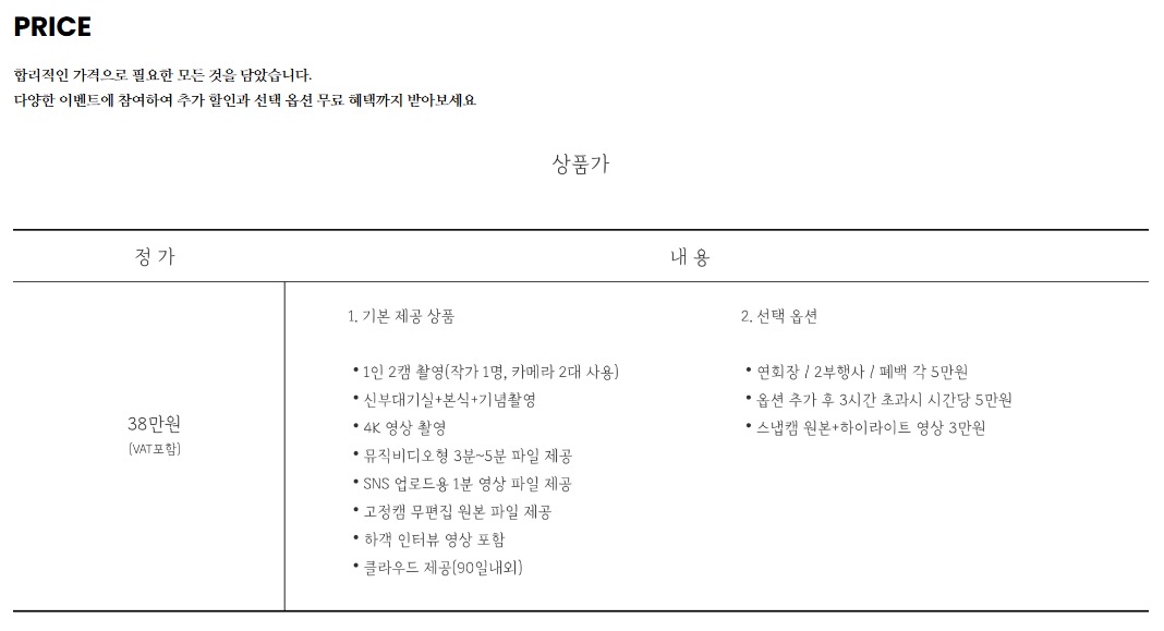 르랑필름은 부가세 포함 38만원이라 가격이 일단 굉장히 합리적이었고, 당시에 할인 이벤트도 진행 중이라 실제로는 더 저렴해질 예정이라 부담이 확 줄었어요. “싸서 좋다”보다는, 예산을 계획한 그대로 가져갈 수 있겠다는 느낌이 더 컸습니다. 그리고 ‘이건 기본, 이건 선택’이 구분되어 안내가 정리돼 있어서, 괜히 욕심내다가 예산 깨지는 흐름을 막기 쉬워 보였어요.